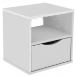 Buro de noche blanco con un cajón. El buro es cuadrado y está fabricado en melamina. Presenta un diseño moderno y minimalista. En la parte inferior, hay un cajón con una apertura curvada para extraerlo. Encima del cajón, cuenta con un espacio abierto que podría utilizarse para almacenar o exhibir objetos.