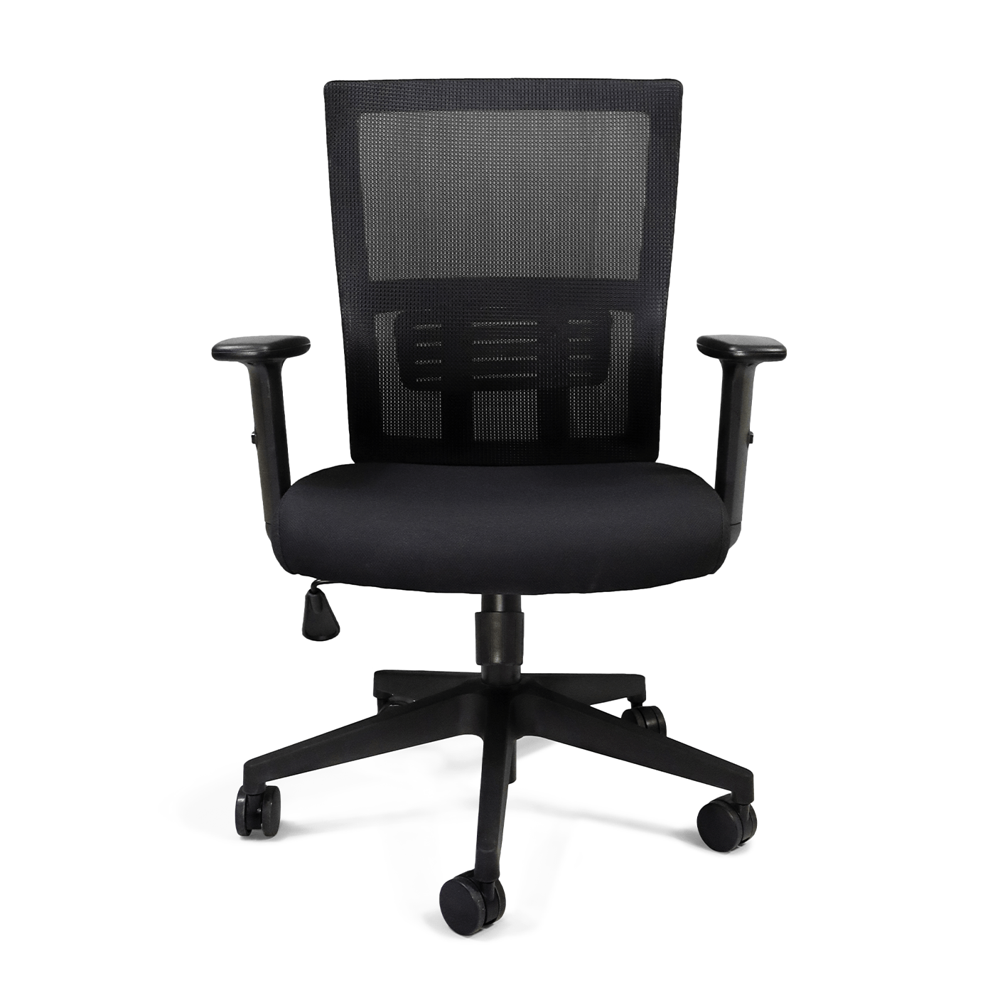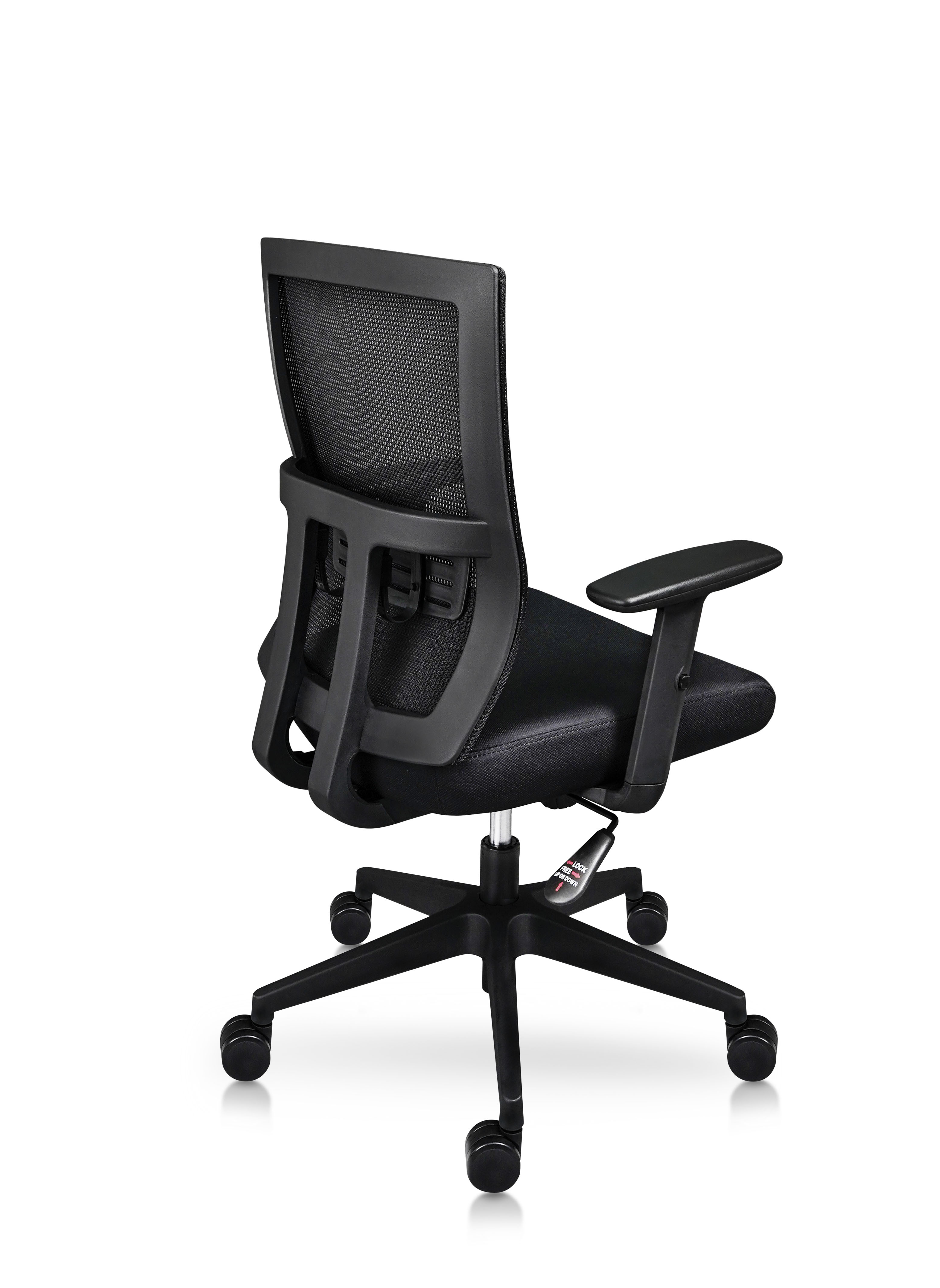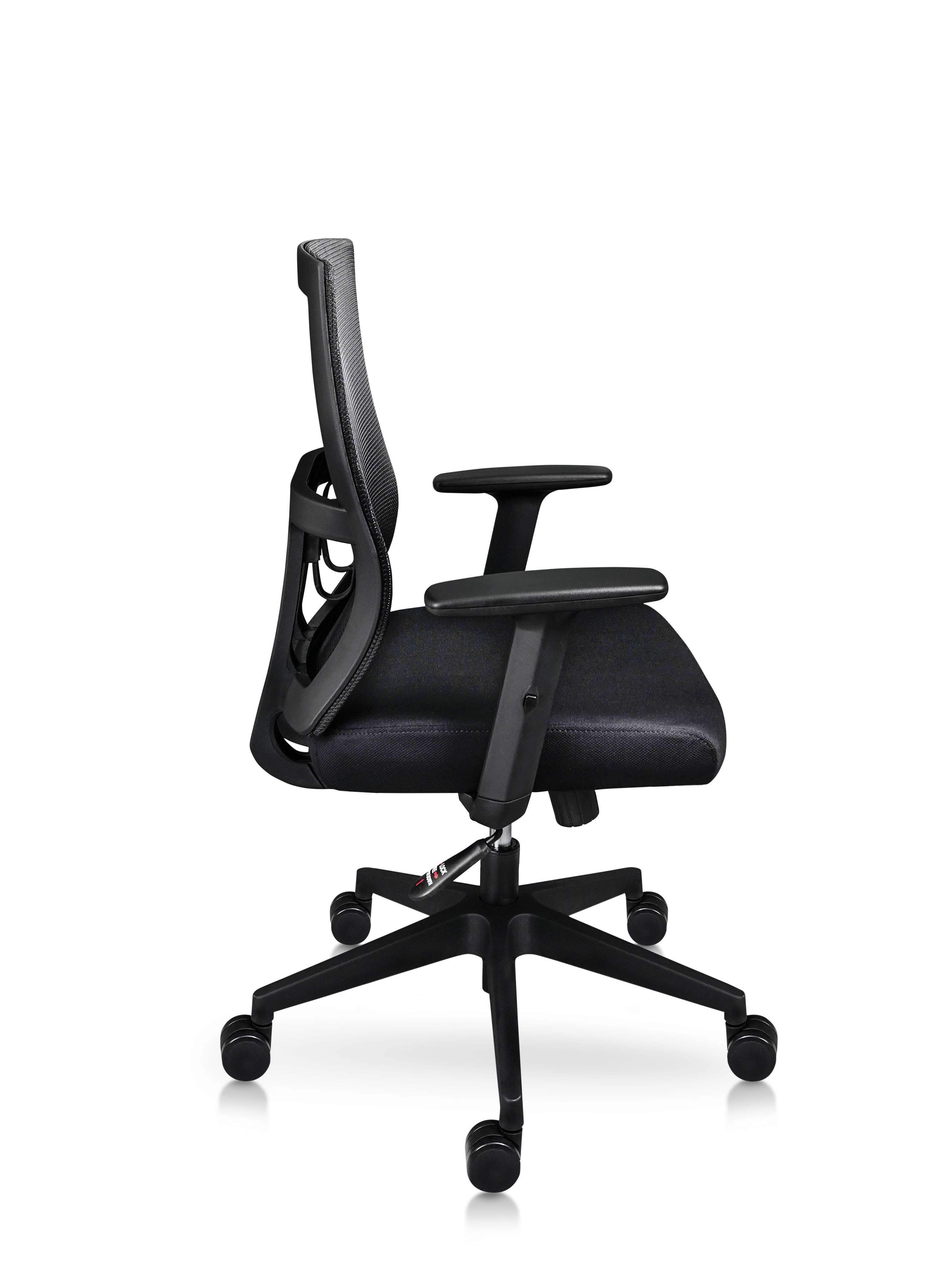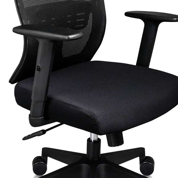 Respaldo medio tapizado en malla, con soporte lumbar, asiento tapizado en tela, brazos fijos, estrella pentagonal.
