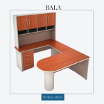 Conjunto ejecutivo mod. Bala Fabricado en melamina de 16 mm, color a elegir. con canto de PVC. Se compone de mesa punta de bala con pata metálica cilíndrica, lateral rectangular con faldón pedestal fijo, que consta de dos cajones uno papelero y uno de archivo. Credenza y librero sobre credenza, que consta de cuatro puertas abatibles con jaladera y cuatro entrepaños. Dimensiones: 180 x 230 x 75 cm