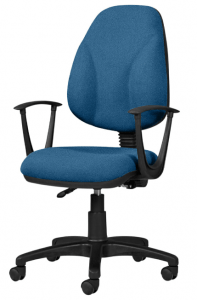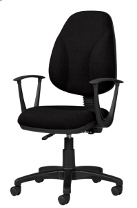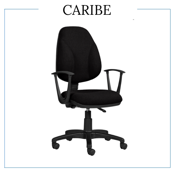 Respaldo de posición ajustable. Descansabrazos fijos. Mecanismo con elevación neumática de altura. Riñoneras de espuma ergonómica en respaldo. Tapizado en tela color negro.
