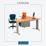 Escritorio en “L” mod. Congos Cubierta fabricada en melamina de 16 mm, color a elegir, con canto en PVC. Patas metálicas. Con cajonera móvil, con 1 papelero y 1 de archivo, jaladeras metálicas y chapa de seguridad. Dimensiones: 150 x 150 x 75 cm