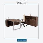 Escritorio en L Fabricado en melamina de 16 mm, con canto de PVC. Cubierta sobre pata metálica, lateral tipo credenza con entrepaños una puerta abatible y un pedestal fijo de tres cajones, dos papeleros y uno de archivo con jaladeras metálicas y chapa de seguridad. Librero mixto, con puertas abatibles 2 espacios superiores. Dimensiones: 150 x 150 x 75 cm