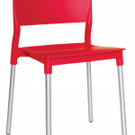 Las patas están elaboradas con aluminio tubular de 1″ de diámetro y calibre 16, con un acabado natural. Tanto el asiento como el respaldo forman una sola pieza fabricada en polipropileno de alta resistencia y durabilidad, diseñada para resistir las condiciones climáticas adversas, incluyendo la exposición a los rayos ultravioleta (UV) y al ambiente salino. La silla está disponible en colores aqua, blanco y rojo, con una capacidad máxima de resistencia de 100 kilogramos.
