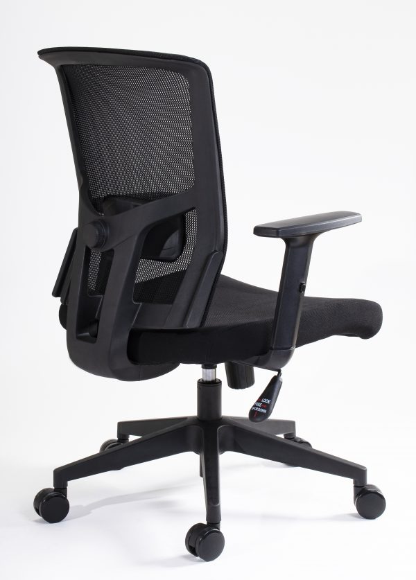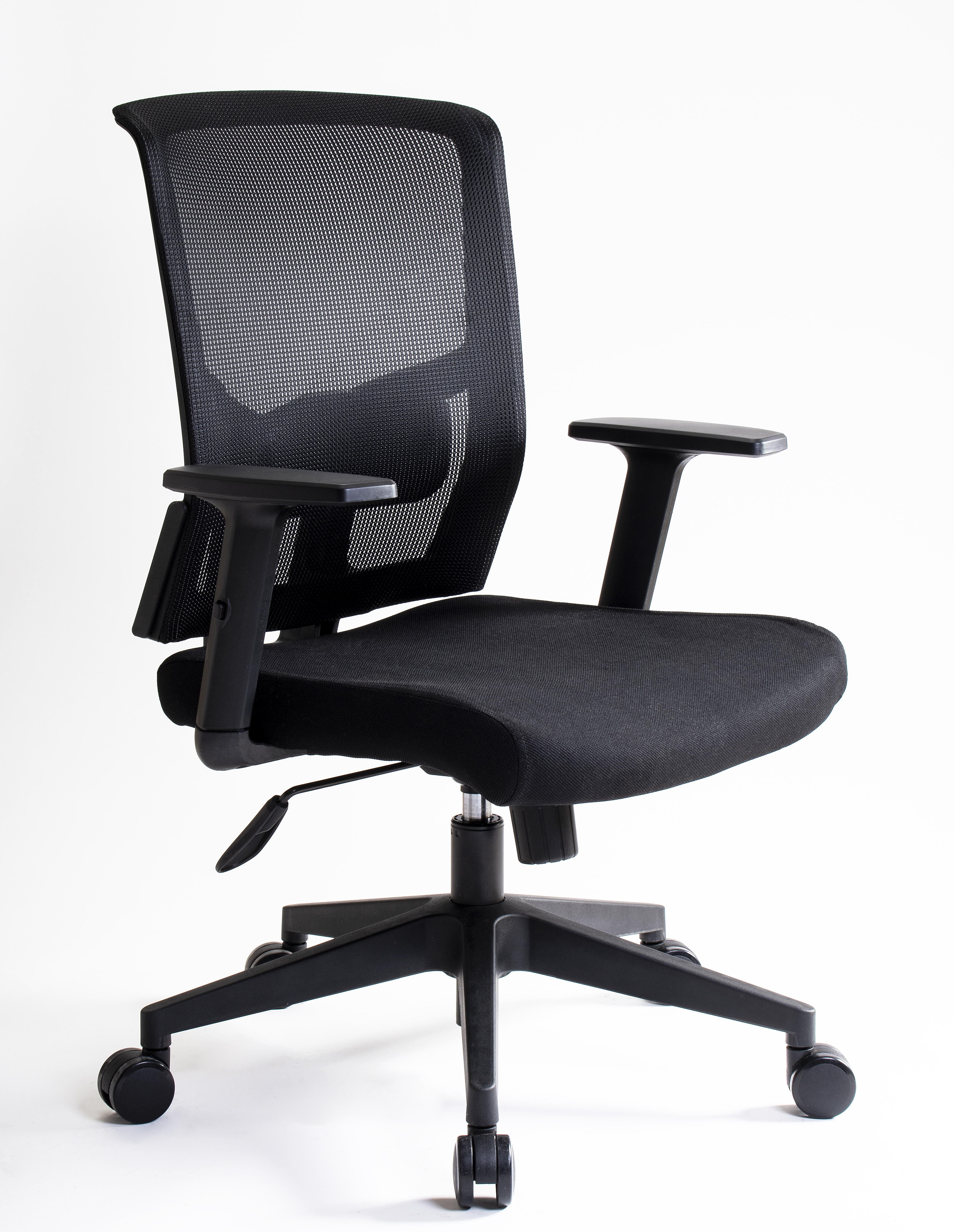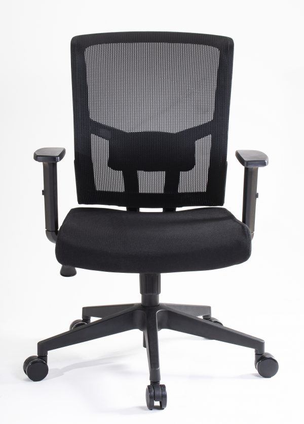 Respaldo tapizado en malla con almohadilla lumbar ajustable. Brazos con ajuste de altura y codera en poliuretano suave deslizantes. Asiento tapizado en tela crepe con espuma estándar.