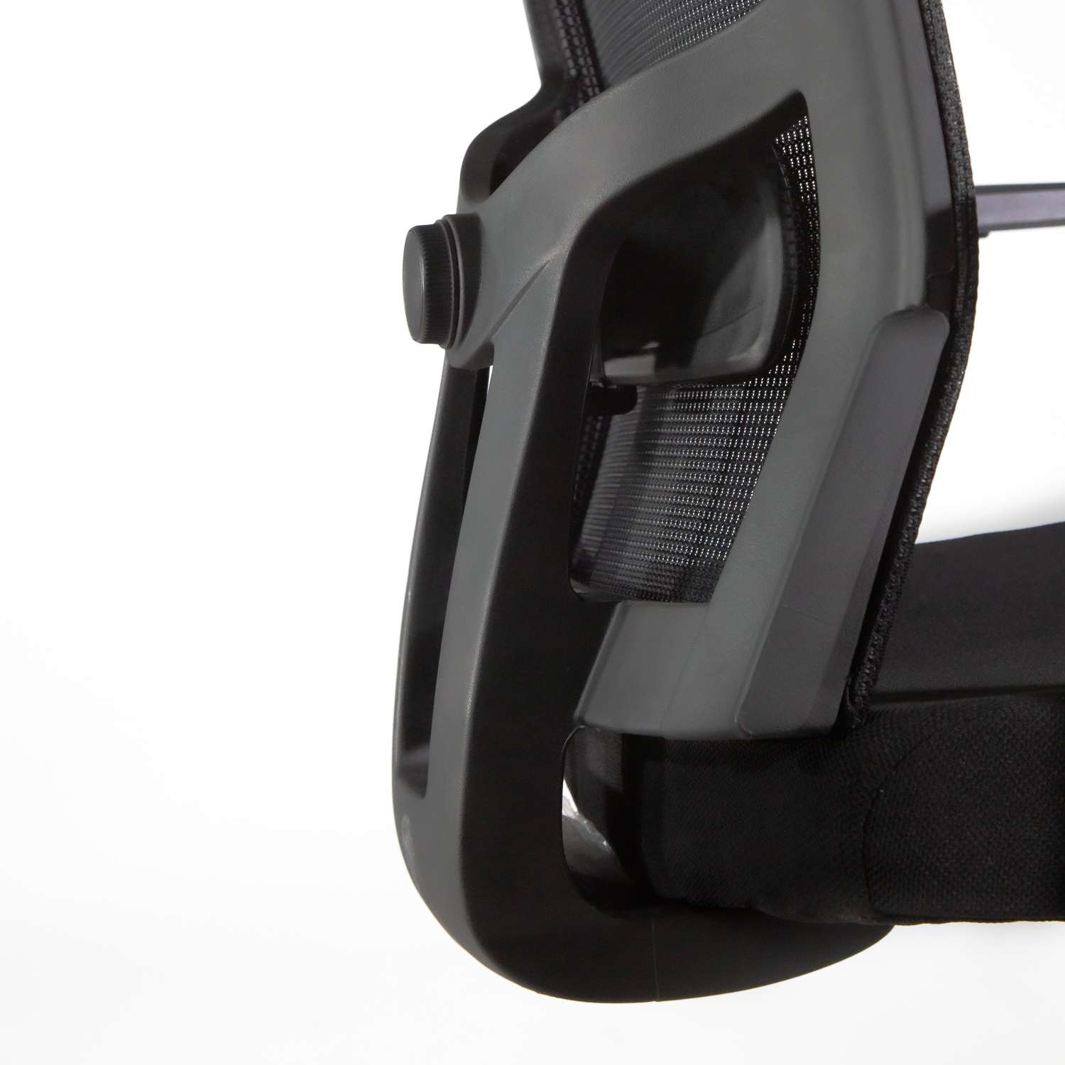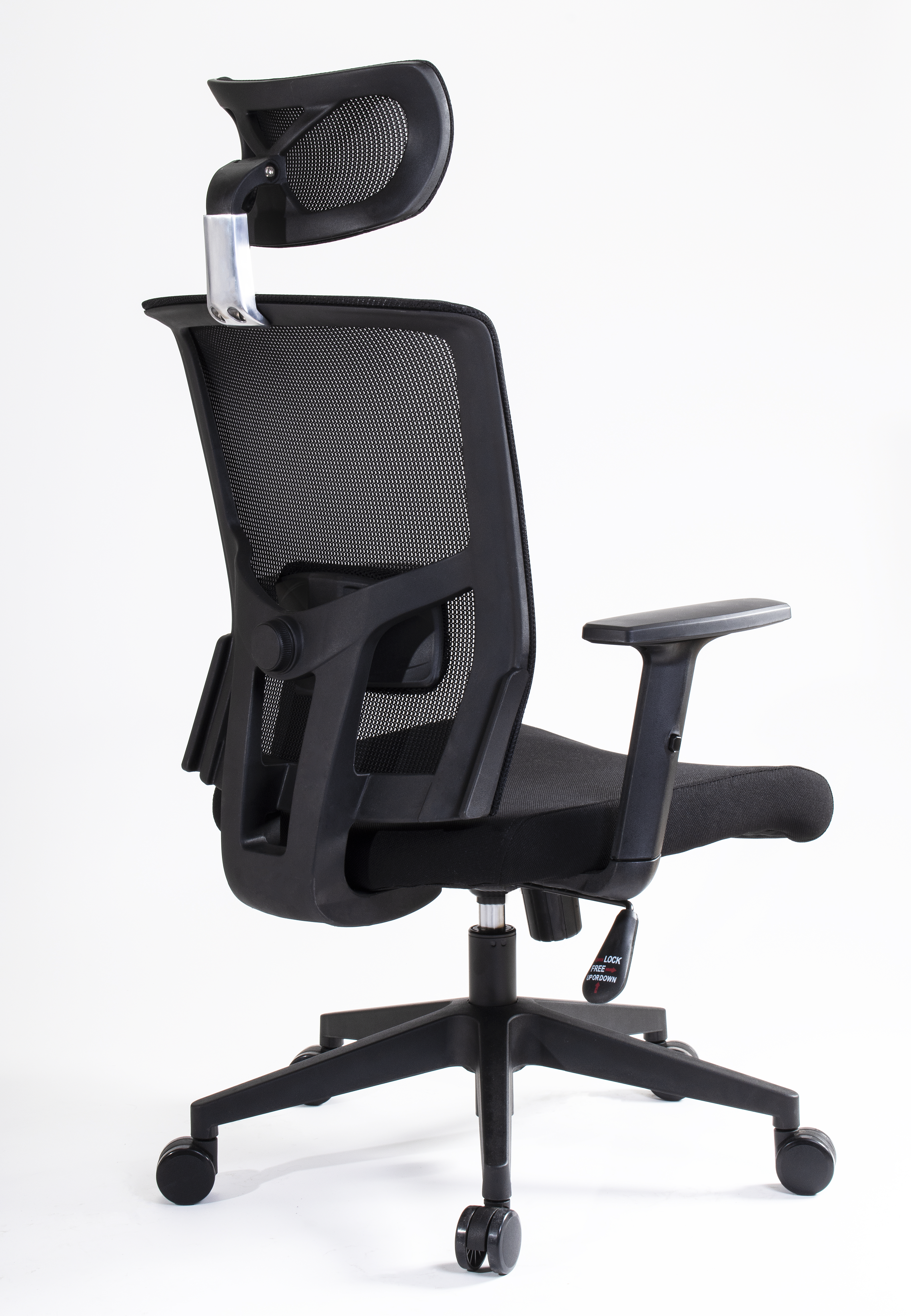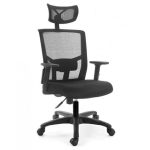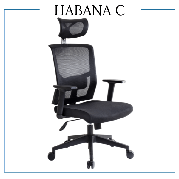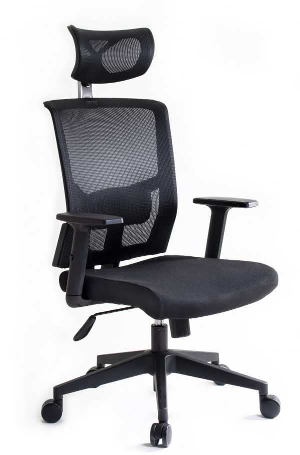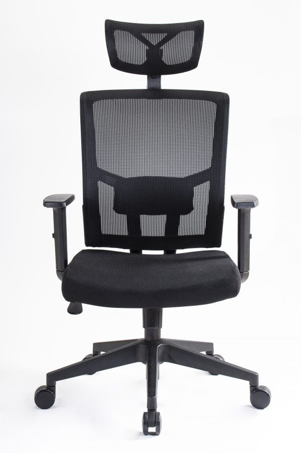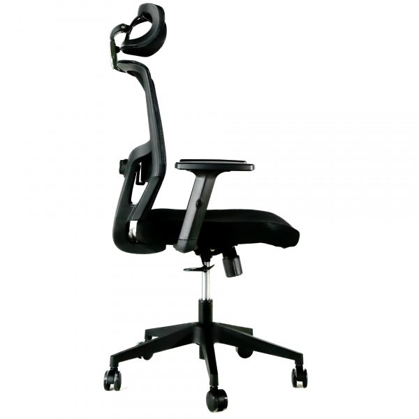 Respaldo tapizado en malla con almohadilla lumbar ajustable. Cabecera tapizada en malla. Brazos con ajuste de altura y codera en poliuretano suave deslizantes. Asiento tapizado en tela crepe con espuma estándar.