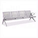 Asiento y respaldo en una sola pieza de lámina de acero calibre 14 multiperforada, diseño ergonómico y pintura epóxica electrostática horneado color gris con doblez en los extremos y esquinas para evitar filos. Trabe horizontal inferior para soportar los asientos terminado en pintura epóxica electrostática horneado color gris. Patas y brazos en aluminio sólido, aparentan ser una sola pieza con regatones con cuerda para altura regulable.
