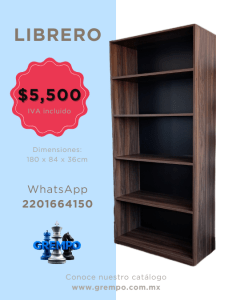 Melamina de 16mm, con cinta PVC, niveladores de polipropileno. Se compone: 4 entrepaños abiertos, formando 5 espacios. Dimensiones: 80 x 40 x 180 cms
