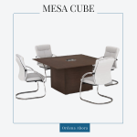 Mesa de juntas Cubierta fabricada en melamina de 28mm y base en 16 mm de espesor, color a elegir de nuestro catálogo. Con canto en PVC Base en forma de cubo. Dimensiones: 100 x 100 x 75 cm