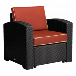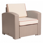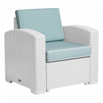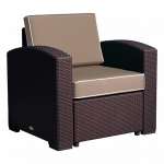 Mobiliario: fabricado en polipropileno de alta durabilidad y resistencia, apto para su uso tanto en exteriores como en interiores, siendo resistente a los rayos ultravioleta (UV) y a condiciones salinas, con un acabado que simula rattán.