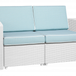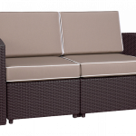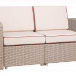 Sofá de exterior: fabricado en polipropileno de alta durabilidad, adecuado tanto para uso en exteriores como en interiores, resistente a los rayos ultravioleta (UV) y a condiciones salinas, con acabado simulando rattán. El asiento y respaldo están acolchados con hule espuma laminado flexible de alta densidad, ofreciendo una resistencia óptima. Soporta un peso máximo de 280 kgs..
