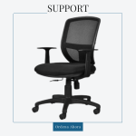 Con descansabrazos. Asiento tapizado en tela y respaldo tapizado en malla color negro. Mecanismos de ajuste de altura, inclinación de respaldo y precisión de tensión. Base de nylon con rodajas de nylon.