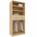 Este closet espacioso está diseñado para satisfacer tus necesidades de almacenamiento, cuenta con compartimentos superiores para guardar diversos objetos, un par de cajones en la parte media para accesorios y prendas pequeñas, y una barra resistente en la parte inferior. Su diseño funcional y versátil te permite mantener tu guardarropa ordenado y accesible, mejorando tu experiencia de vestir. Este closet de calidad premium está listo para ser promocionado, y se pueden hacer ajustes según sea necesario en cuanto a medida y color.