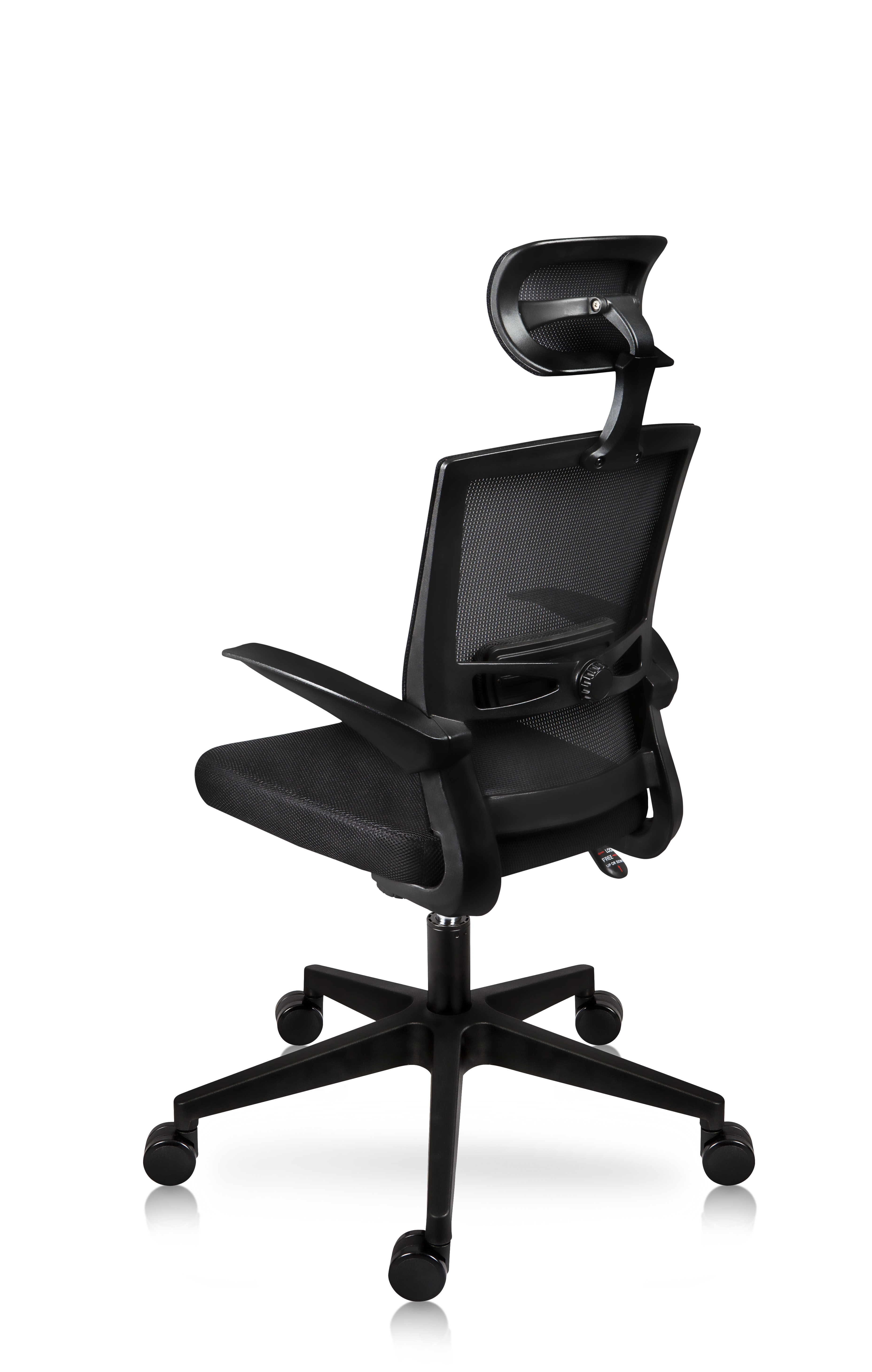Descripción: Respaldo tapizado en malla con almohadilla lumbar ajustable. Cabecera tapizada en malla. Brazos plegable en polipropileno. Asiento tapizado en tela mesh con espuma estándar. Mecanismo ejecutivo con palanca para ajuste de altura. Palanca para bloquear reclinamiento y perilla tensora. Pistón de rodilla rebasador de base. Base pentagonal y rodajas de 60mm en nylon.